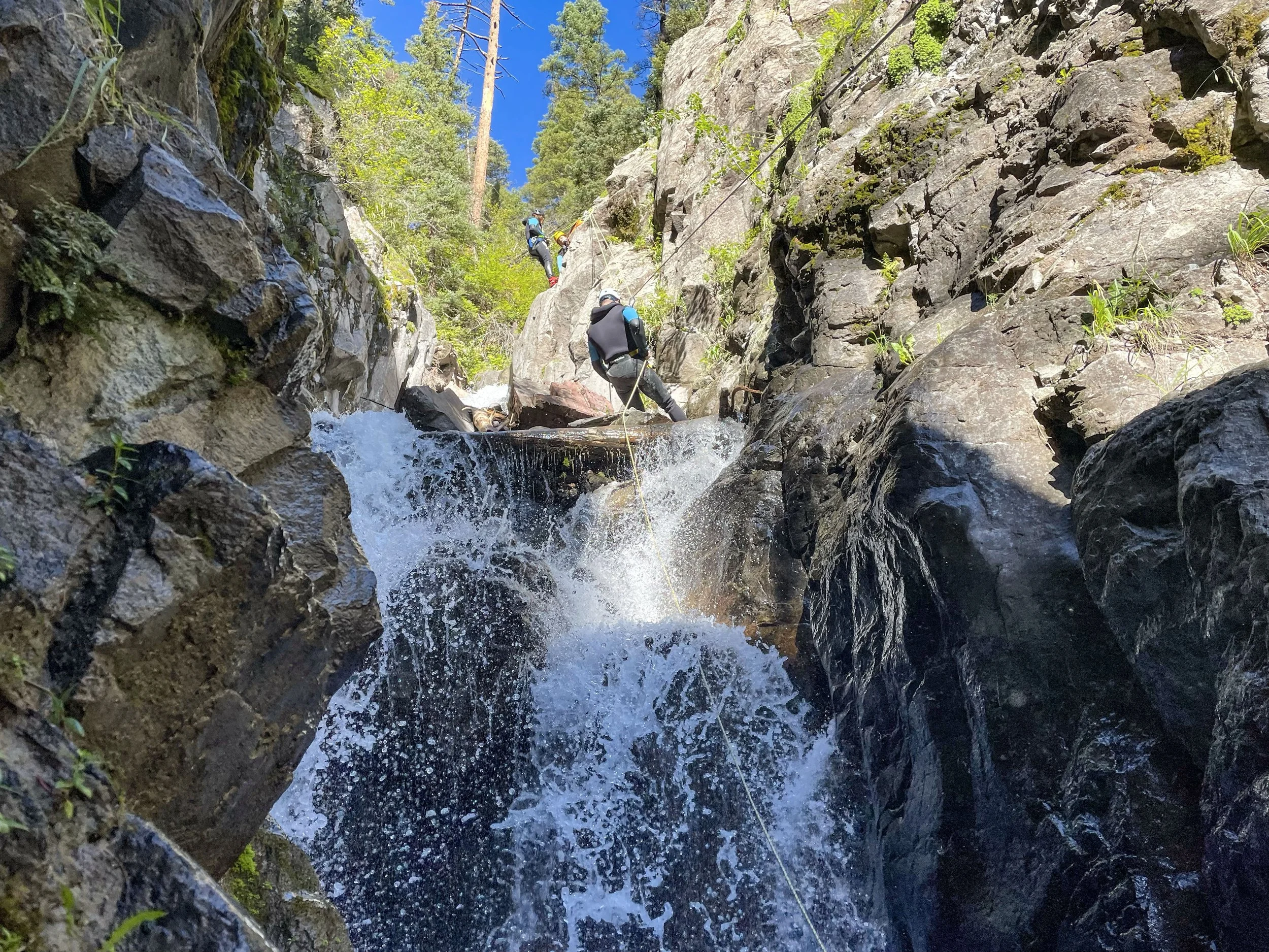 Walking out to Kayden, and getting our repelling devices situated, I took a moment to peer below to see nothing but mist from the waterfall, tall Ponderosa Pines, red color bouncing off the rocks, and Cascade Falls just across the town of Ouray. Once ready, I pushed my legs against the rock, got my body weight back, and slowly released the rope through my hands. Getting used to the speed of which I wanted to comfortably release, I took my time for the first part. After about 20 feet, I was going faster, bouncing my feet against the rock to swing just enough to make me giggle. To my left, I watch the water pouring itself down at a much faster rate that I ever would want to go. Towards the bottom, I feel the mist brushing my face like little butterfly kisses before plunging to the pool below. It only came up to my knees, so it was easy to stay upright.