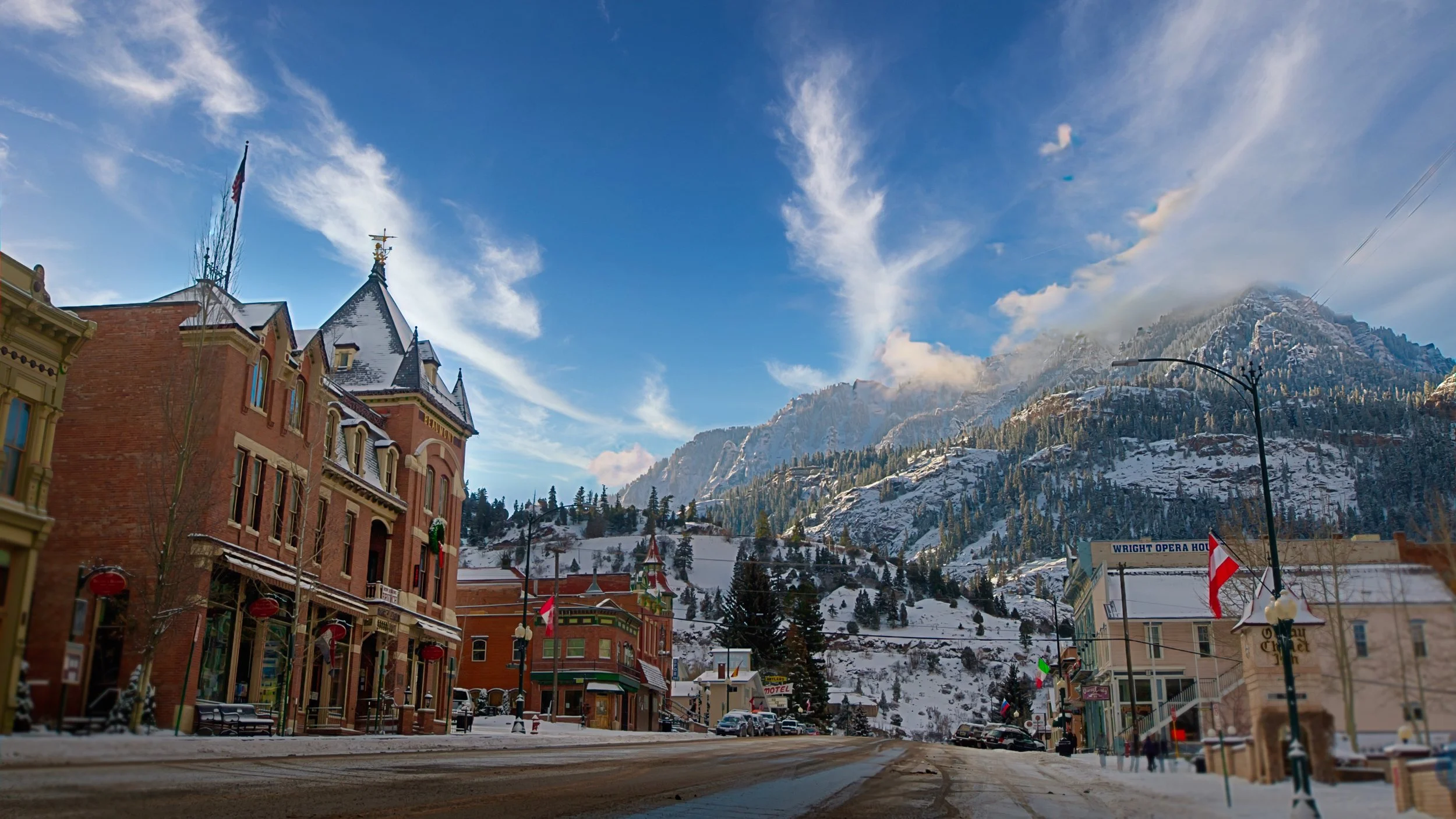 Ouray Main Street in the winter time with views of Mt. Hayden and the Beaumont Hotel